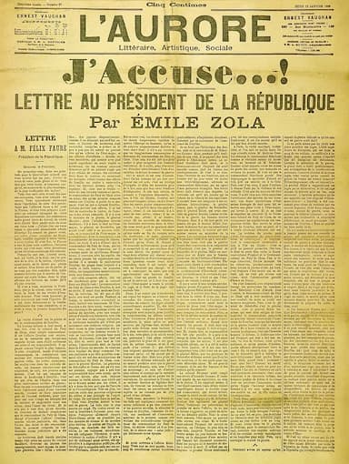 En 1898, après l’acquittement du commandant Esterhazy, Émile Zola publie une lettre ouverte intitulée « J’accuse… » dans le journal l’Aurore. En raison des accusations portées contre l’état-major, Zola est condamné pour diffamation.