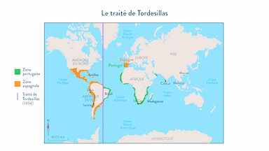 • La colonisation de l’Amérique débute ainsi sur le Traité de Tordesillas, excluant les autres puissances européennes et donnant un quasi-monopole de la découverte aux couronnes d’Espagne et du Portugal.