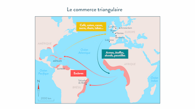 C’est réellement entre le XVIIIe et le XIXe siècle que la traite des Noirs prend une forme véritablement organisée : le « commerce triangulaire » connaît son plein essor. Ainsi, les négriers quittent les ports des puissances européennes en direction des côtes africaines. Ils viennent récupérer les esclaves dans les comptoirs, et prennent la direction des colonies (Guyane, Antilles, Amérique). Les esclaves sont alors vendus, et les bateaux repartent vers les métropoles, chargés de marchandises.